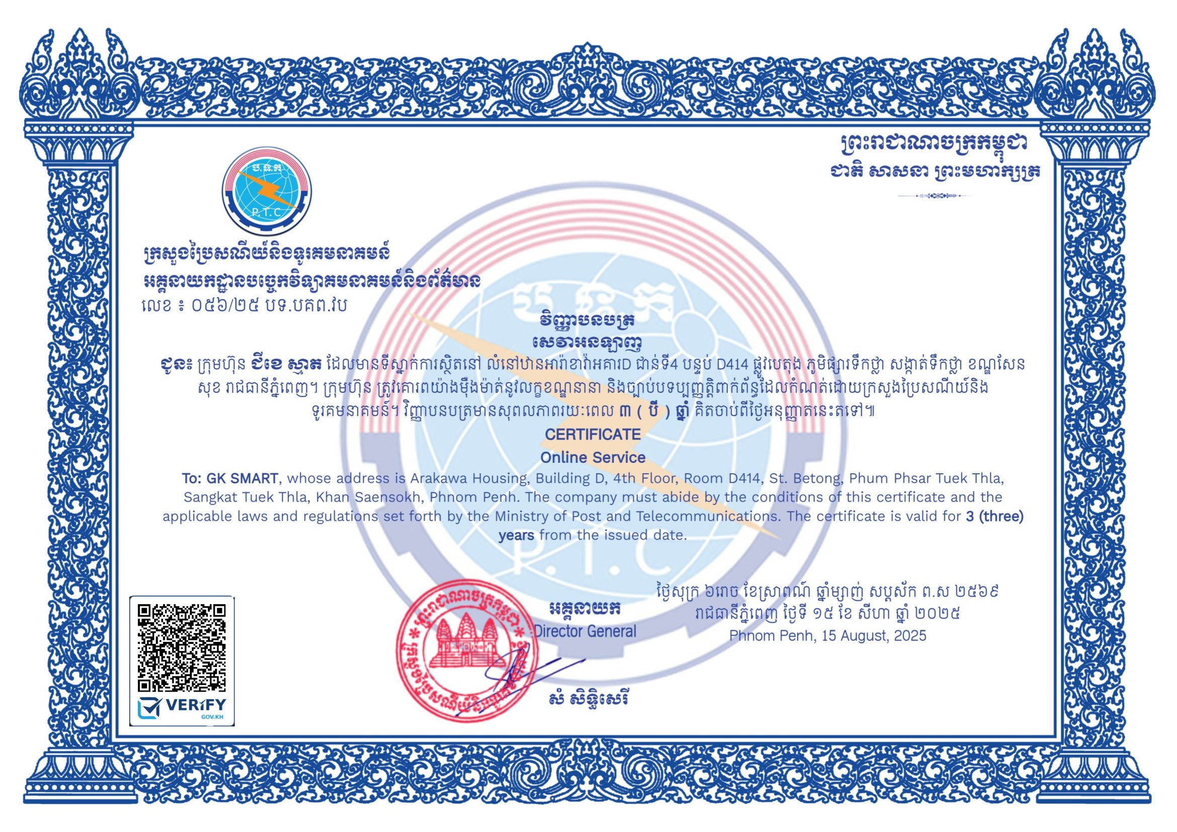 GK SMART is a certified provider of Online Services. You can view our official certificate issued by the Ministry of Post and Telecommunications here: